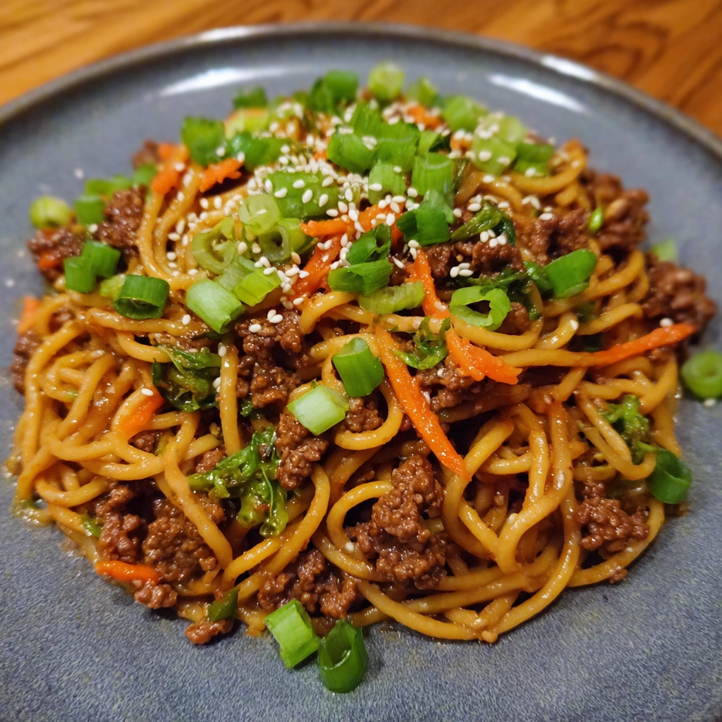 Ground beef and noodles tossed in glossy sauce