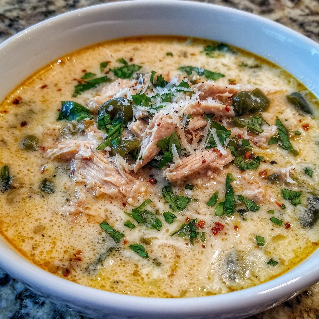 Bowl of creamy chile relleno soup with roasted poblanos, chicken, and cheese.