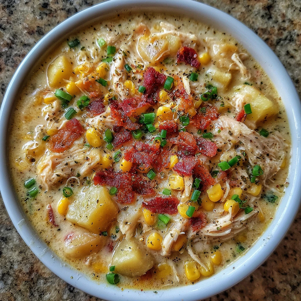 Slow-cooked chowder with visible corn, potatoes, and chicken