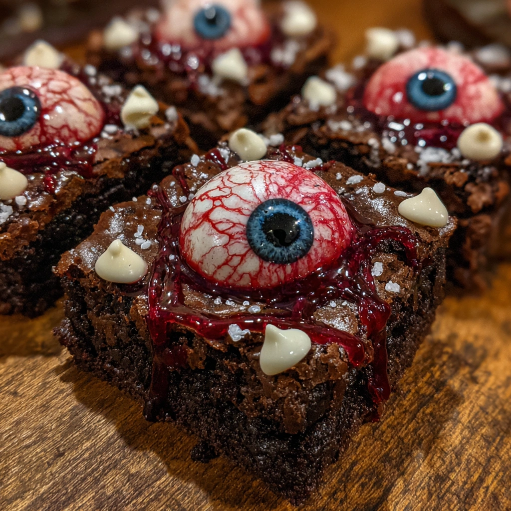 Eyeball Brownies are a creepy-cute addition to your Halloween spread. Fudgy brownies topped with white chocolate, candy eyes, and red gel icing for a bloodshot effect make these treats both spooky and scrumptious. Perfect for parties, kids, and last-minute Halloween fun!