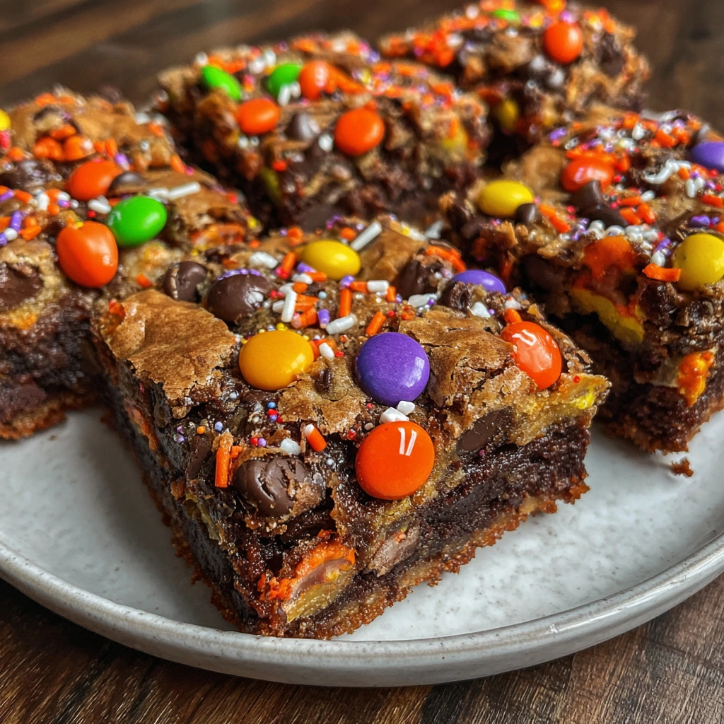 I love how the recipe blends bakery vibes with homey simplicity. It travels well to potlucks and classroom parties, and it satisfies both picky eaters and grown-ups craving something chocolatey. The colors from Halloween M&M’s and sprinkles turn a simple dozen bars into party-ready treats.
