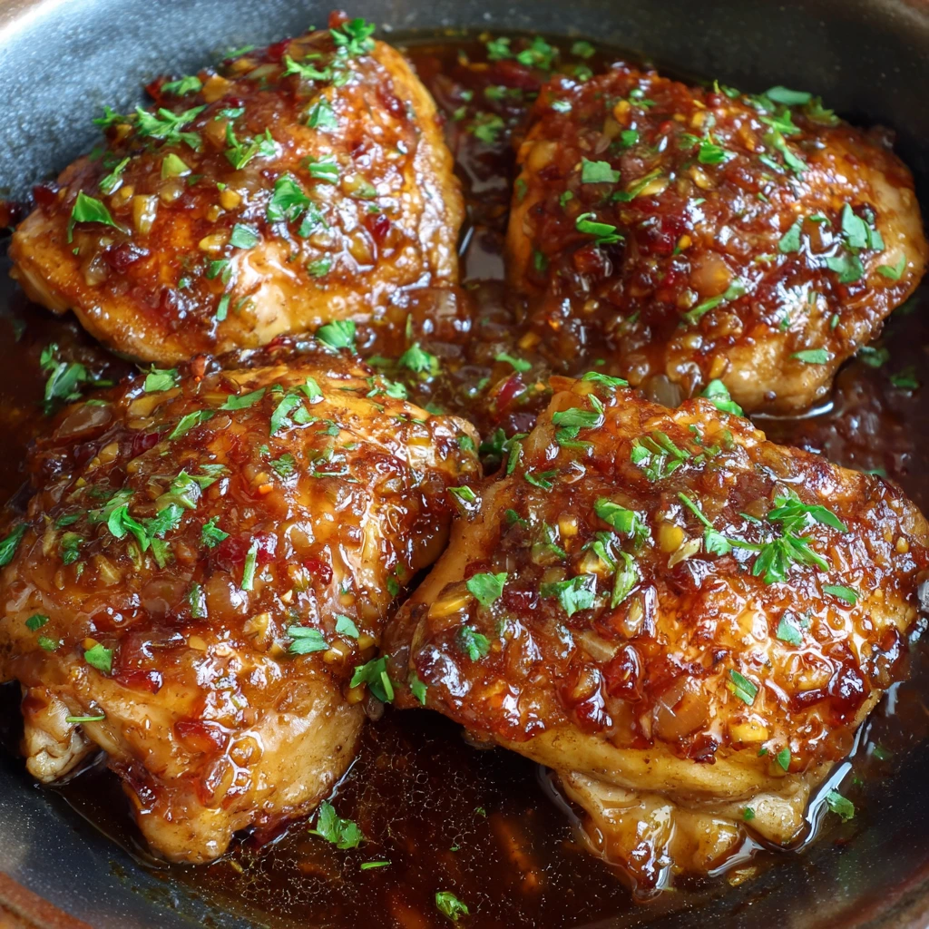 Close-up of juicy chicken breasts glazed with brown sugar garlic sauce.