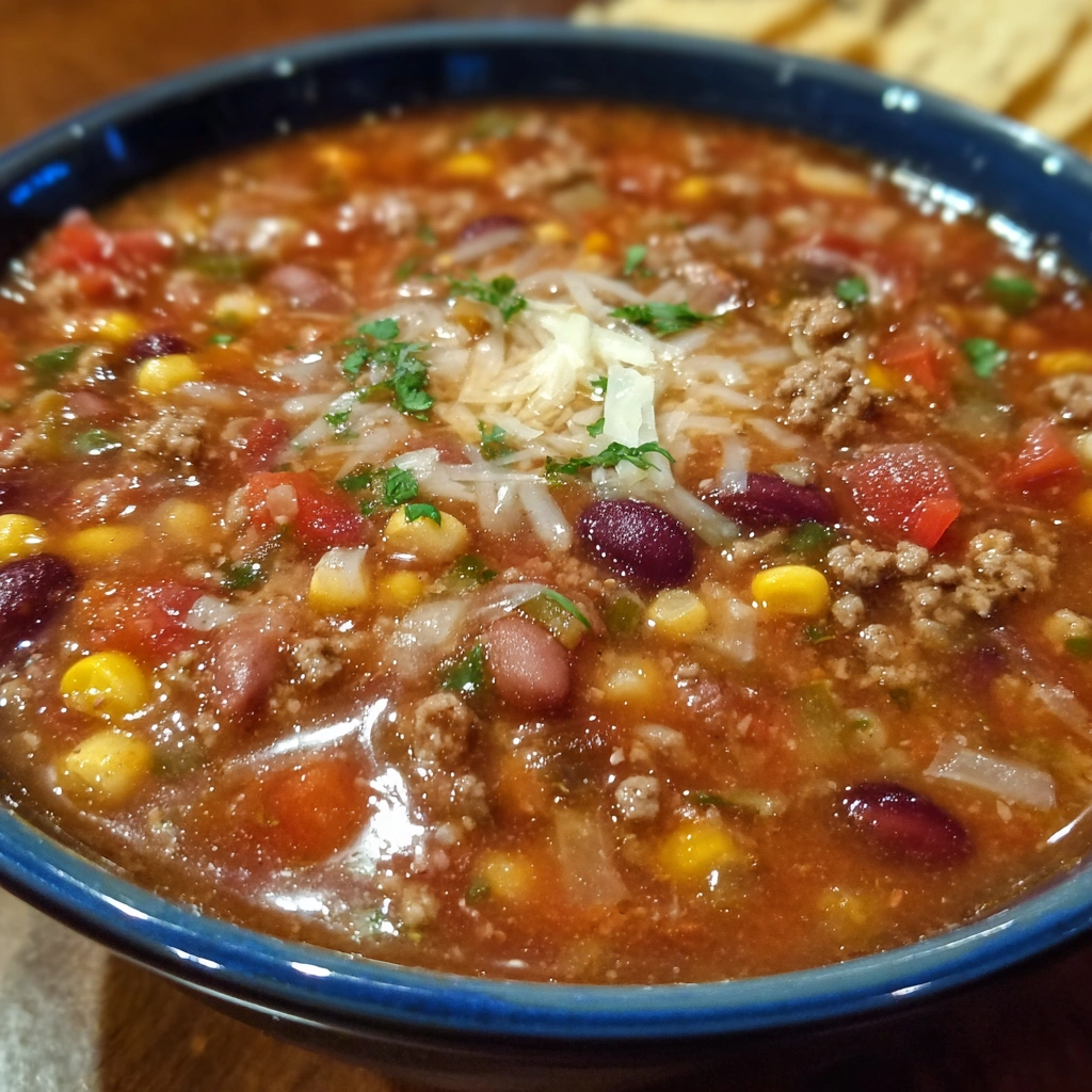 Stove Top Taco Soup delivers bold, zesty flavor in under an hour, a hearty, comforting pot of beef, beans, corn, and chilies.
