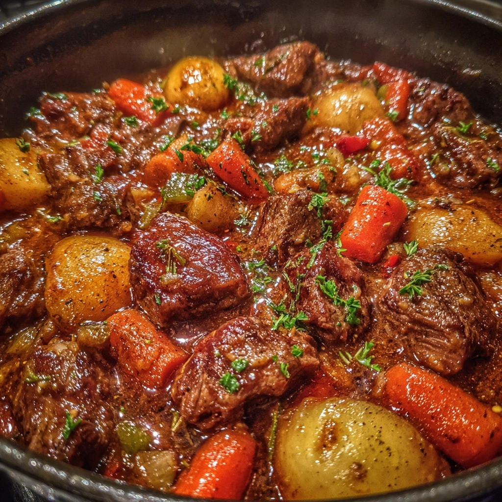 Beef for heft, aromatics for aroma, hearty veggies for texture, and liquid for braising form the core. Seasonings like thyme, rosemary, paprika, and bay leaf weave warmth into the pot, while parsley finishes the dish with a fresh, bright note.